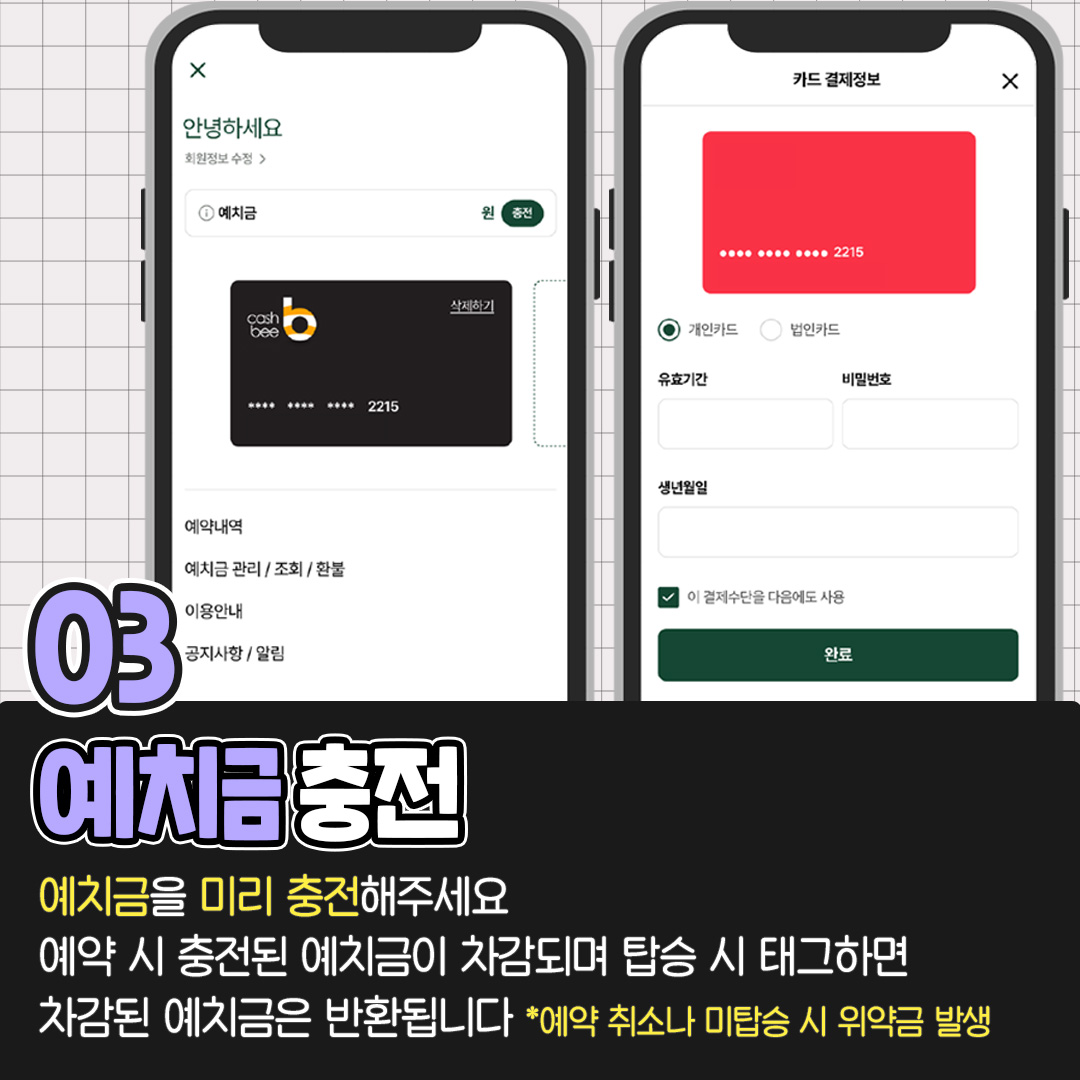 예치금을 미리 충전해주셔야 합니다. 예약 시 충전된 예치금이 차감되며 탑승 시에 태그하면