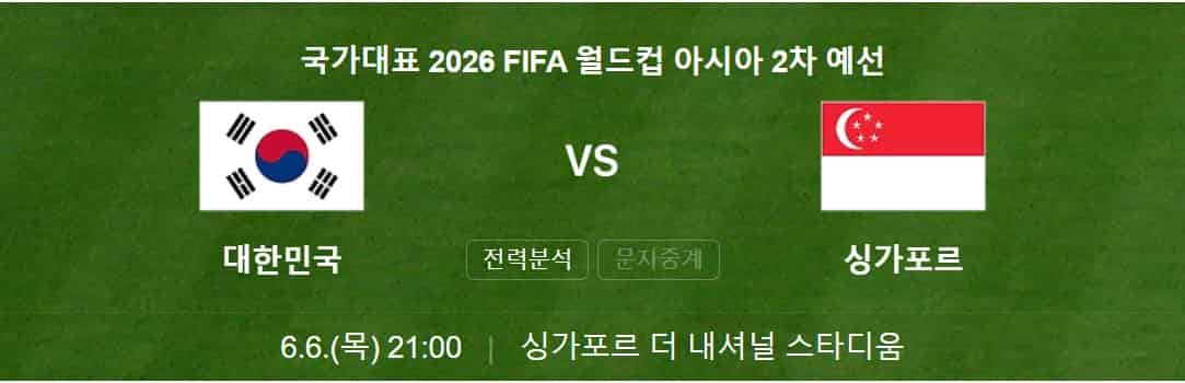 2026 피파 북중미 월드컵 2차 예선 5차전 한국 VS 싱가포르 축구 원정 경기 중계 방송 보러 가기, 경기 일정, 하이라이트 경기, 전력 분석 및 각 대표팀별 주요 선수